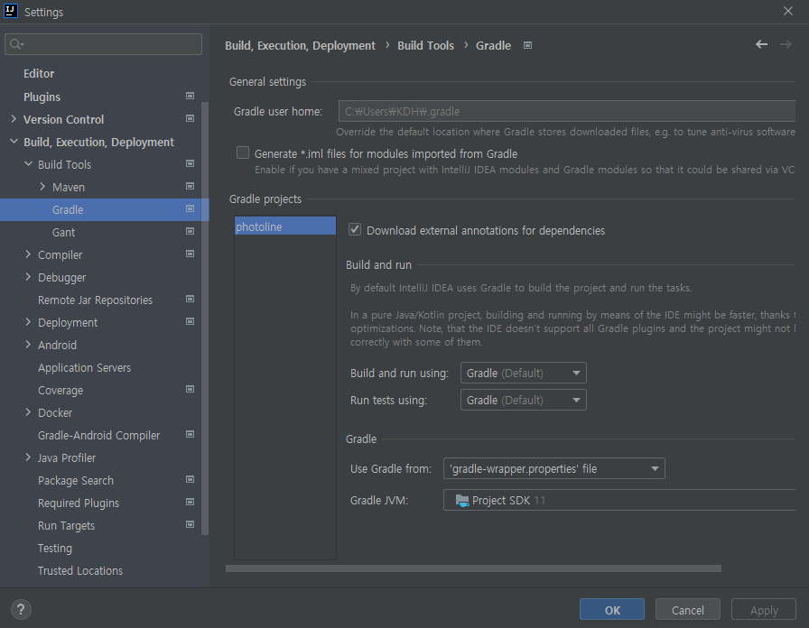 Settings - Build, Execution, Deployment - Build Tools - Gradle 에서 Build and run using, Run test using이 각각 Gradle로 기본 설정되어 있다. 이를 IntelliJ로 변경해준다.